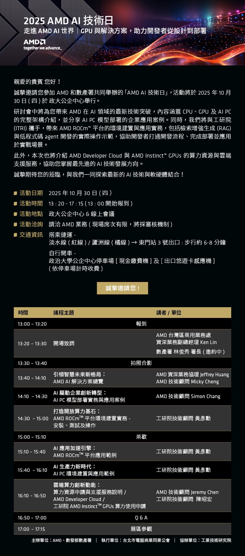 由 AMD 與 數位發展部數位產業署 共同舉辦的「AMD AI 技術日」,將於 2025年10月30日(四)13:00 在 國立政治大學公企中心 盛大登場。