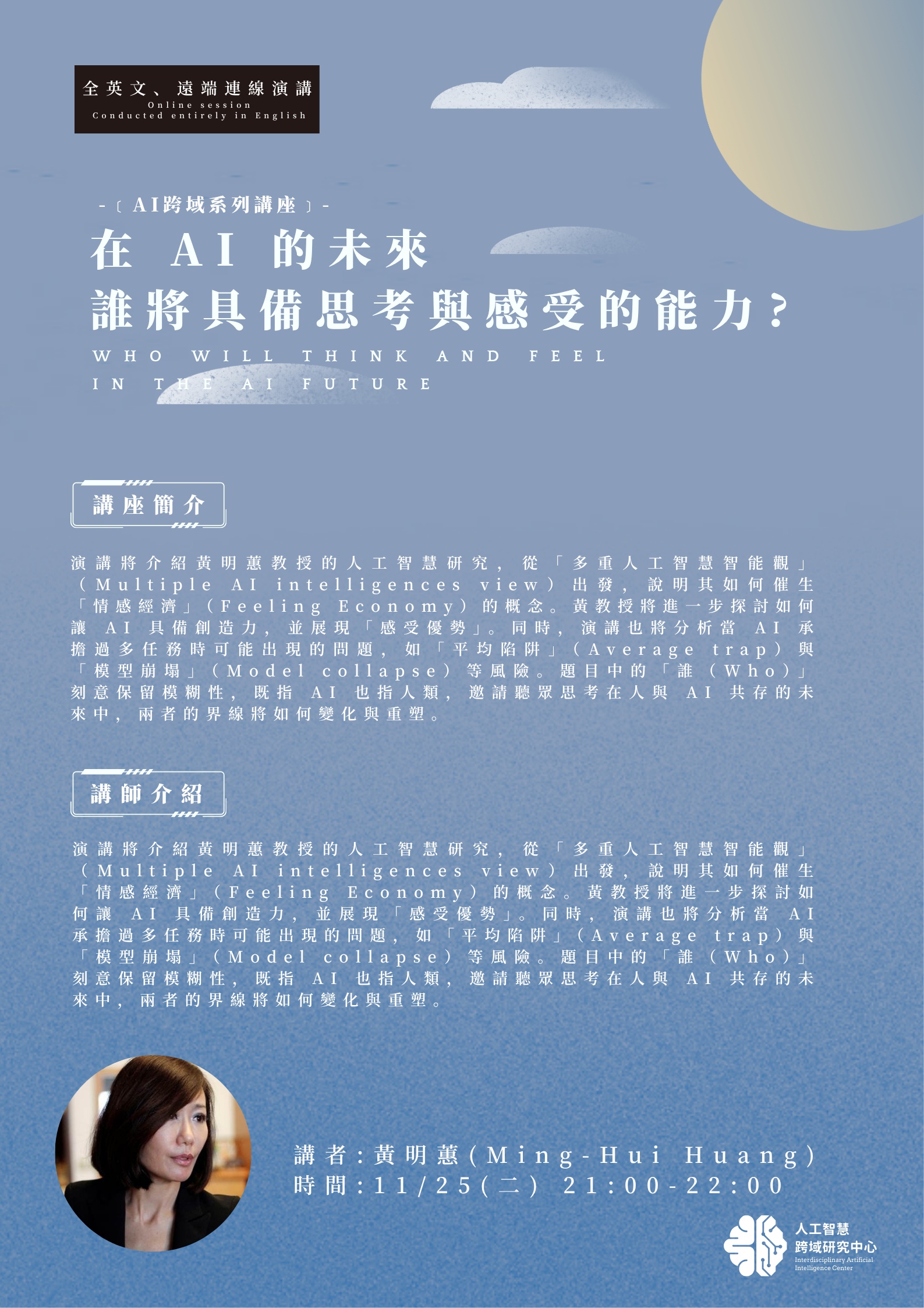 本次演講將介紹黃明蕙教授的人工智慧研究計畫,首先從「多重人工智慧智能觀」(multiple AI intelligences view)的核心理念出發,說明其如何催生「情感經濟」(Feeling Economy)的概念。接著,黃教授將進一步探討如何讓 AI 具備創造力,並發展出能夠展現「感受優勢」的能力。此外,演講亦將剖析當 AI 承擔過多任務時可能出現的問題,例如「平均陷阱」(average trap)與「模型崩塌」(model collapse)等風險。題目中的「誰(Who)」刻意保留模糊性,既指 AI 也指人類,邀請聽眾共同思考在人與 AI 共存的未來中,兩者之間的界線將如何變化與重塑。