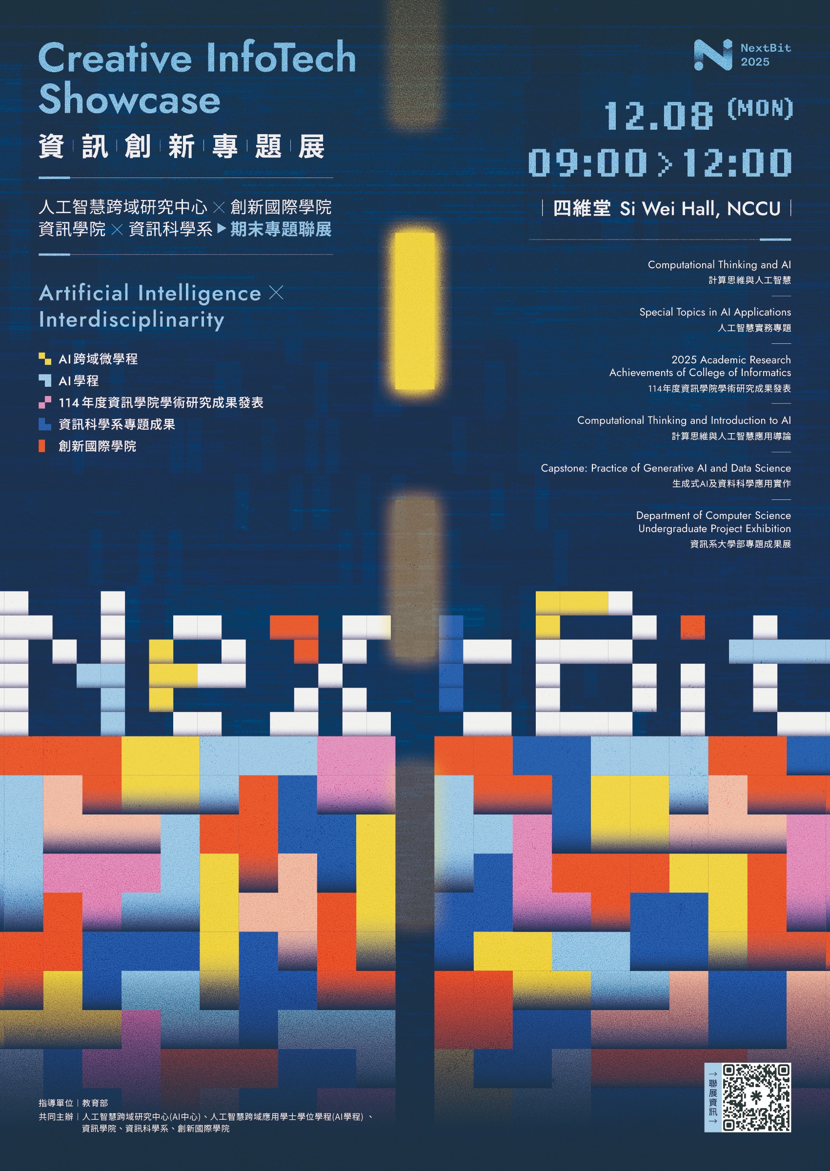 114-1學期期末聯展正式以 「NextBit 資訊創新專題展」 全新定位登場!本展聚焦 AI 跨域課程與資訊相關科系的專題成果,與 6 月的 Innofest 校級聯展 做出更明確的品牌區隔,成為政大資訊與 AI 創新應用的重要年度成果展。本次展出將匯聚 97 組學生團隊,涵蓋從計算思維、人工智慧實務、生成式 AI 應用到跨域應用研究等多元課程成果,完整呈現學生從創意發想、工具操作到跨領域實作的完整歷程。