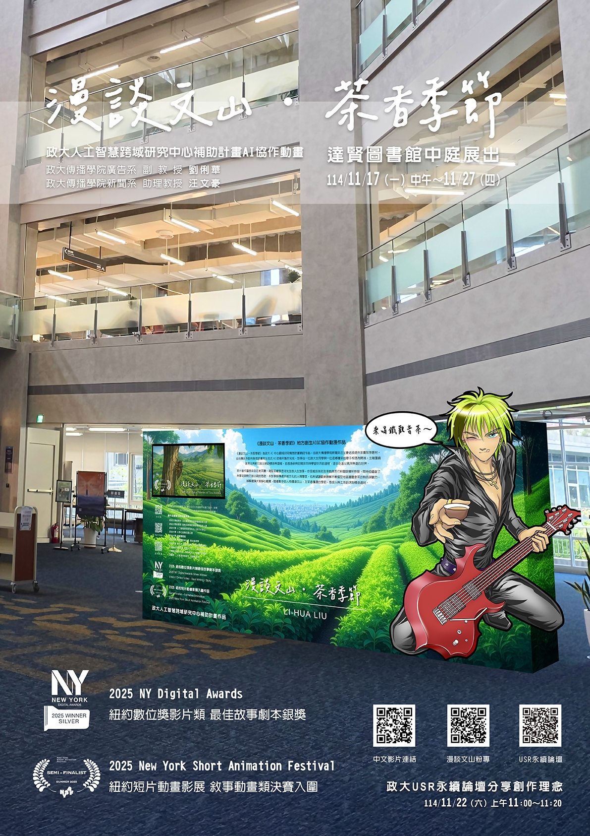 傳播學院廣告系劉俐華老師的AI協作動漫作品《漫談文山‧茶香季節》獲得 2025年NY Digital Awards紐約數位獎影片類「最佳劇本/故事」(Best Writing / Story)銀獎及2025年New York Short Animation Festival 紐約短片動畫影展入圍兩項比賽的肯定,創作研究成果將於114/11/17(一)中午~11/27(四) 於政大達賢圖書館中庭展出,並於114/11/22(六)上午11:00於政大USR永續論壇分享20分鐘的創作理念,歡迎路過師生來參觀或聽創作心得分享。